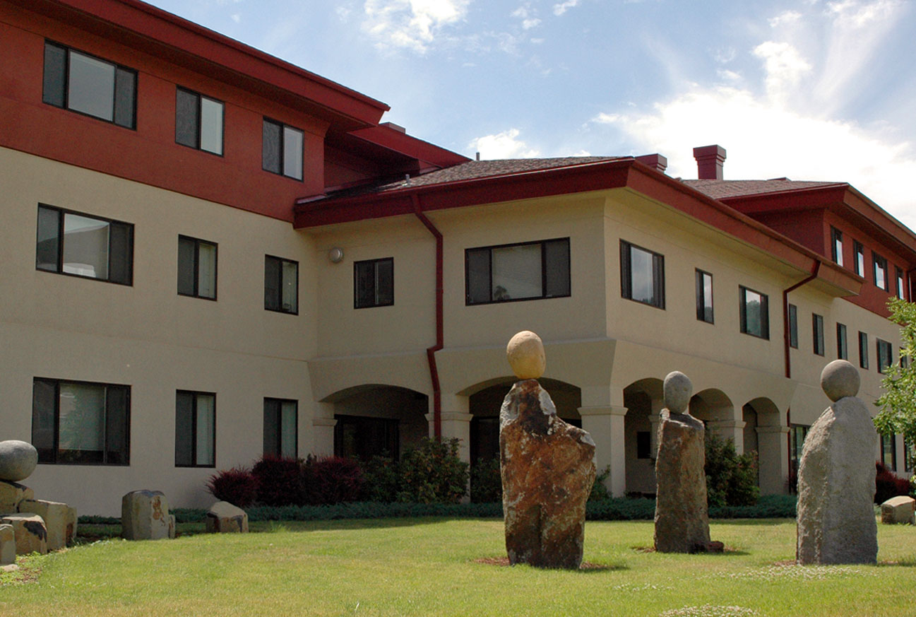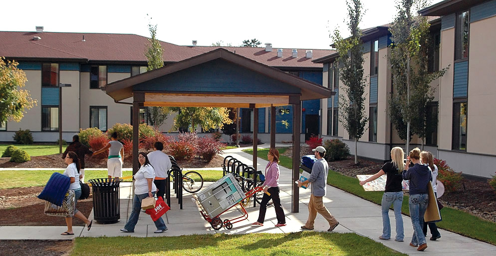 EOU’s newest residence halls were built in 2005 and provide housing for 270 students. Buildings surround an inner courtyard with plenty of green space and a sculpture installation titled “La Grande Weir”.