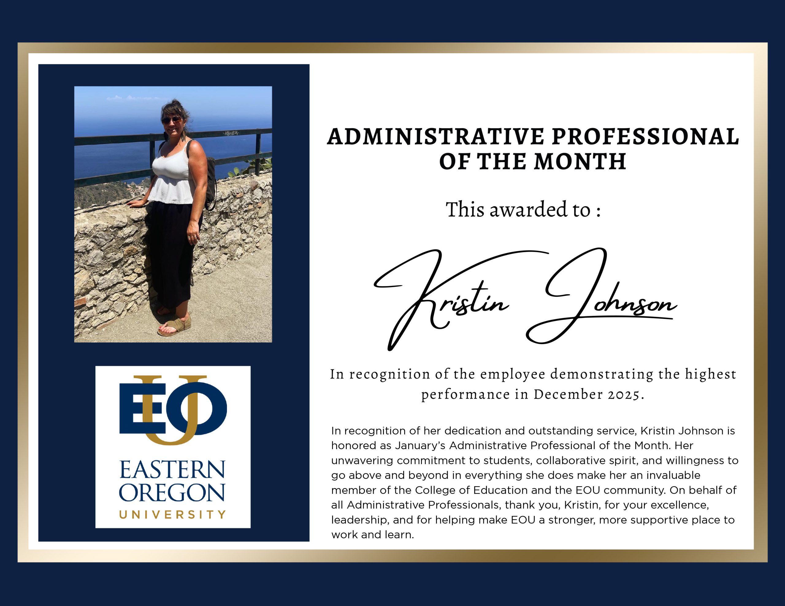 In recognition of her dedication and outstanding service, Kristin Johnson is honored as January’s Administrative Professional of the Month. Her unwavering commitment to students, collaborative spirit, and willingness to go above and beyond in everything she does make her an invaluable member of the College of Education and the EOU community. On behalf of all Administrative Professionals, thank you, Kristin, for your excellence, leadership, and for helping make EOU a stronger, more supportive place to work and learn.