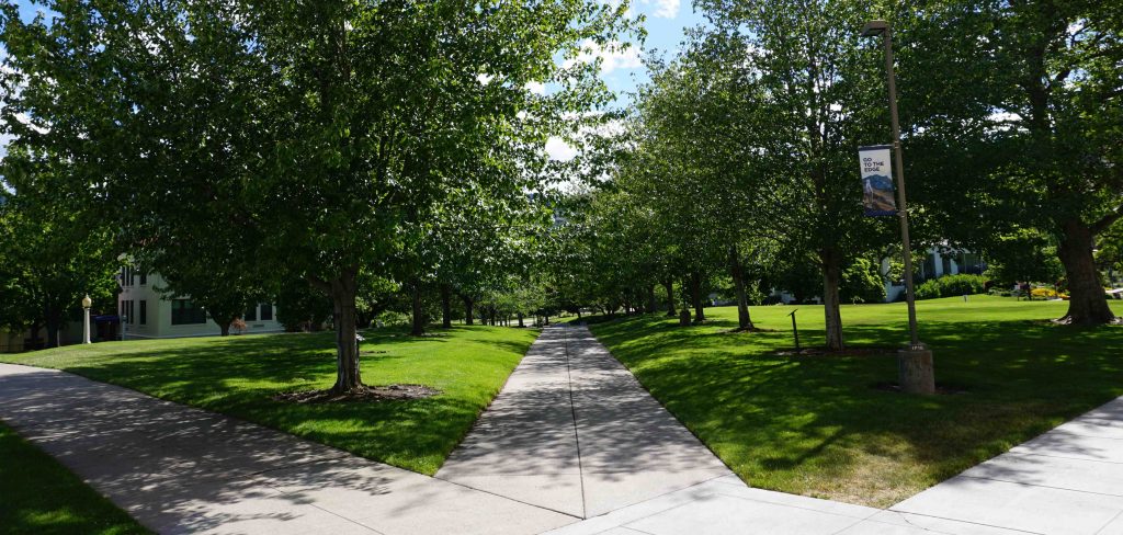 one sidewalk path splitting into three surrounded by trees and grass
