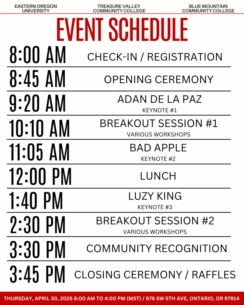This year’s gathering offers opportunities to connect with local leaders, students, educators, and community members from across Eastern Oregon. We invite students, faculty, staff, community members, and partners from Eastern Oregon and beyond to join us for a day of connection, learning, and shared conversation. This event is free and open to the public. Please click the button below to register!