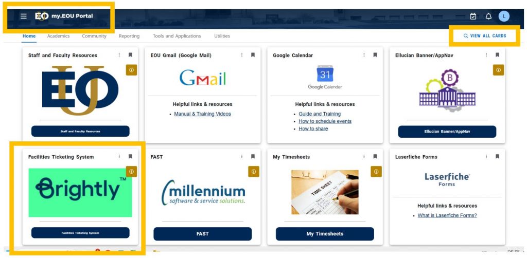 (If this tile doesn’t show on your main page you will need to click on “VIEW ALL CARDS” in the upper right-hand corner and search for Brightly on that page) IF you have an eou.edu email you can enter a ticket.