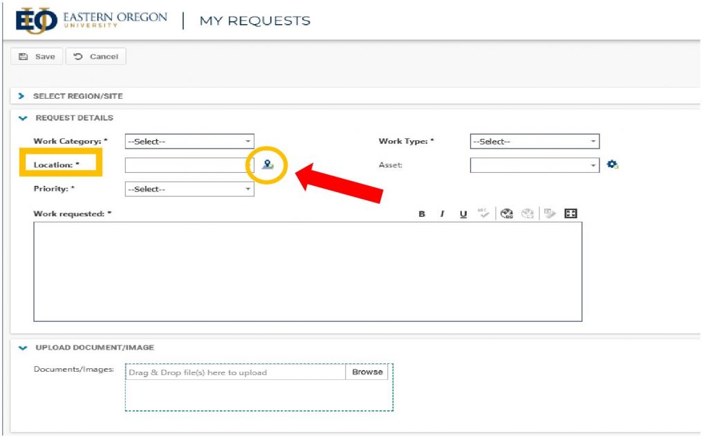 Items marked with an asterisk (*) are required fields. Drop down menus can be used for all choices with the exception of “Location” here you will need to pick location icon in order to capture the correct location options.