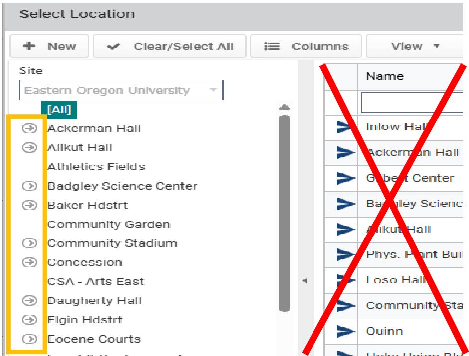 When you click on the location icon a “select location” menu will pop up. Pick a location from the LEFT side menu by clicking on arrow to the left of the asset name: