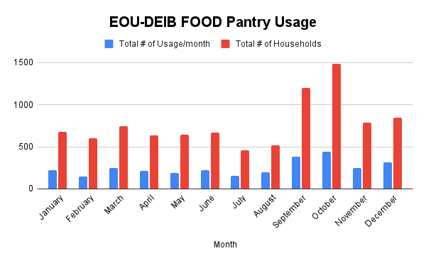 The Food Pantry and Benefits Navigator program launched in September 2022 with a single small pantry serving approximately 50 students per month. In 2023, the program expanded to include two additional satellite pantries on campus and broadened the range of available food resources. As shown in the graph to the left, this expansion enabled the program to support more than 250 students per month, reflecting substantial growth in both reach and impact.