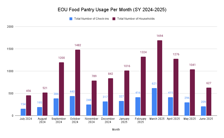 During the 2024–2025 academic year, we observed a significant increase in the use of our on-campus food pantries. As shown in the table to the right, our pantries supported more than 4,000 individuals, representing over 12,000 household members. On average, approximately 400 individuals accessed our pantries each month. These numbers demonstrate a substantial need for food resources among our student population and reinforce the importance of maintaining accessible on-campus pantries as a critical first step in addressing food insecurity and supporting students’ basic needs.