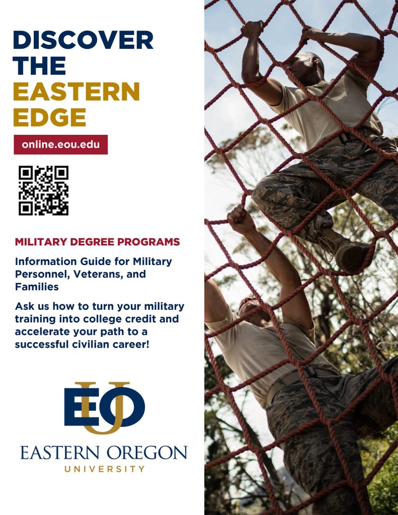 We’ll work with you to provide the best resources, credit for military service, scholarships and benefits for spouses and dependents. EOU is also a member of the Service Members Opportunity Colleges and we’re committed to upholding the “Principles of Excellence” outlined in Executive Order 13607.