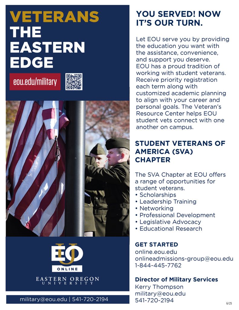 EOU has a proud tradition of working with student veterans and with active service personnel on campus and abroad through online classes. Our veterans and current military register for classes first, our Army Reserve Officers’ Training Corps (ROTC) is active and the Veteran’s Club is a great way to connect with other vets on campus!
