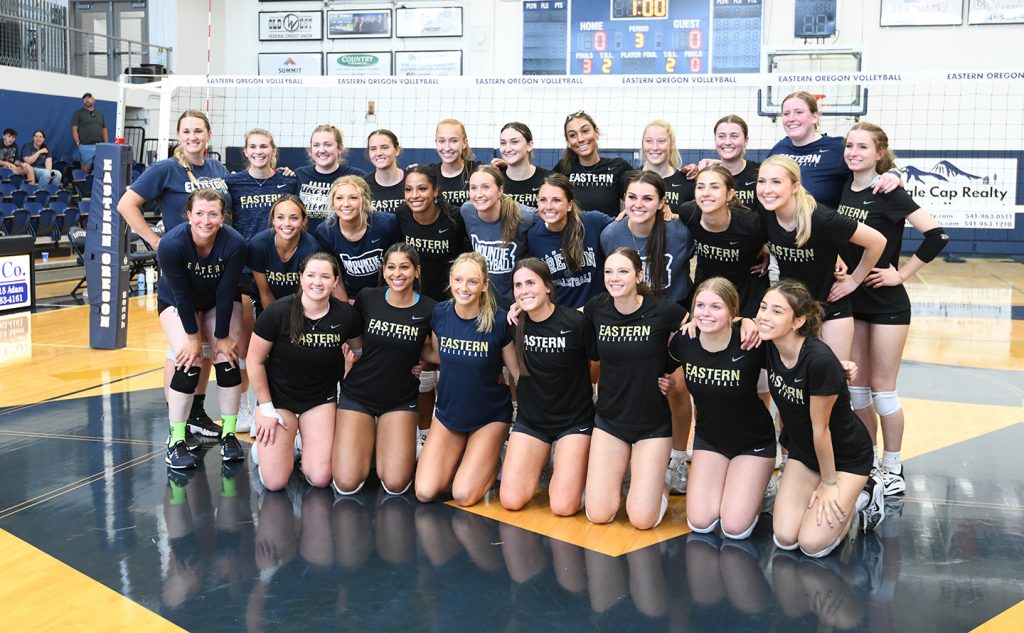 Blue and Gold Weekend will include the annual volleyball alumni game on Saturday, May 17. The 2023-24 team poses with EOU Alum. (EOU photograph / Michael K. Dakota)