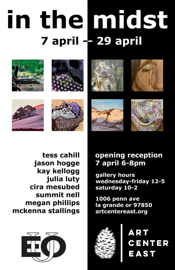 La GRANDE, Ore. – Eastern Oregon University (EOU) is pleased to announce that junior art majors will be presenting current work in their debut exhibition, “in the midst,” at Art Center East in La Grande, Oregon. The featured artists will include: Tess Cahill, Jason Hogge, Kay Kellogg, Julia Luty, Cira Mesubed, Summit Nell, Megan Philips, Mckenna Stallings