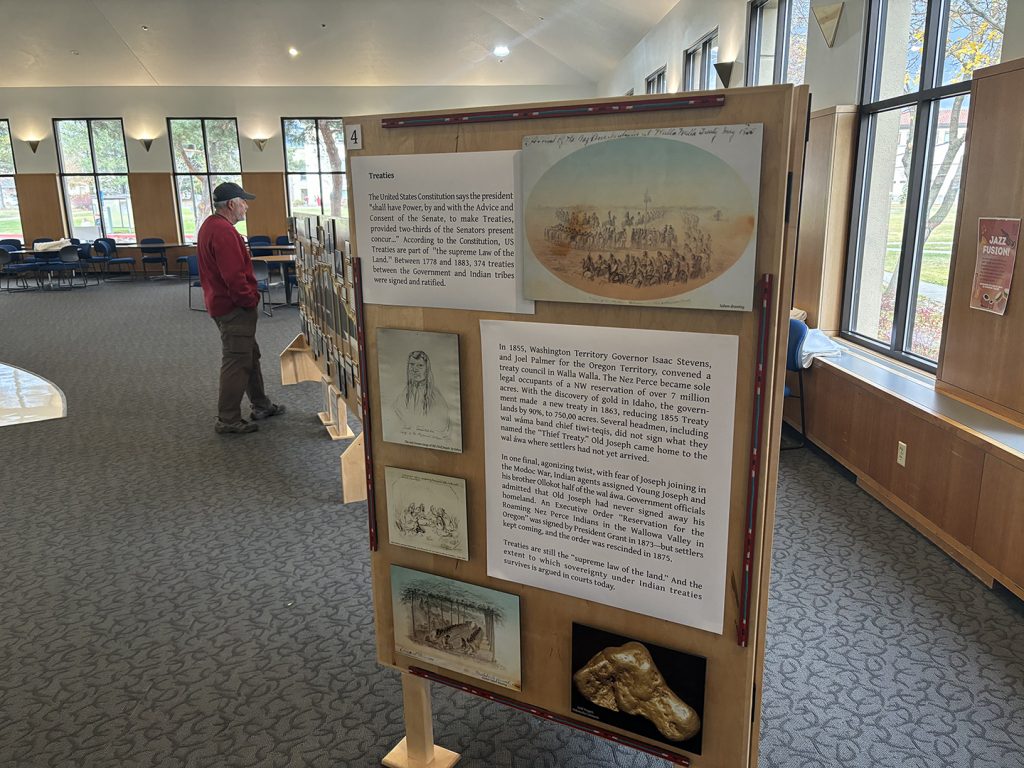 The powerful Nez Perce historical exhibit, funded by a grant from the Oregon State Capitol Foundation, is now on display at Eastern Oregon University (EOU) in the Loso Hall Lobby, before being moved to Blue Mountain Community College (BMCC) following the winter break.
