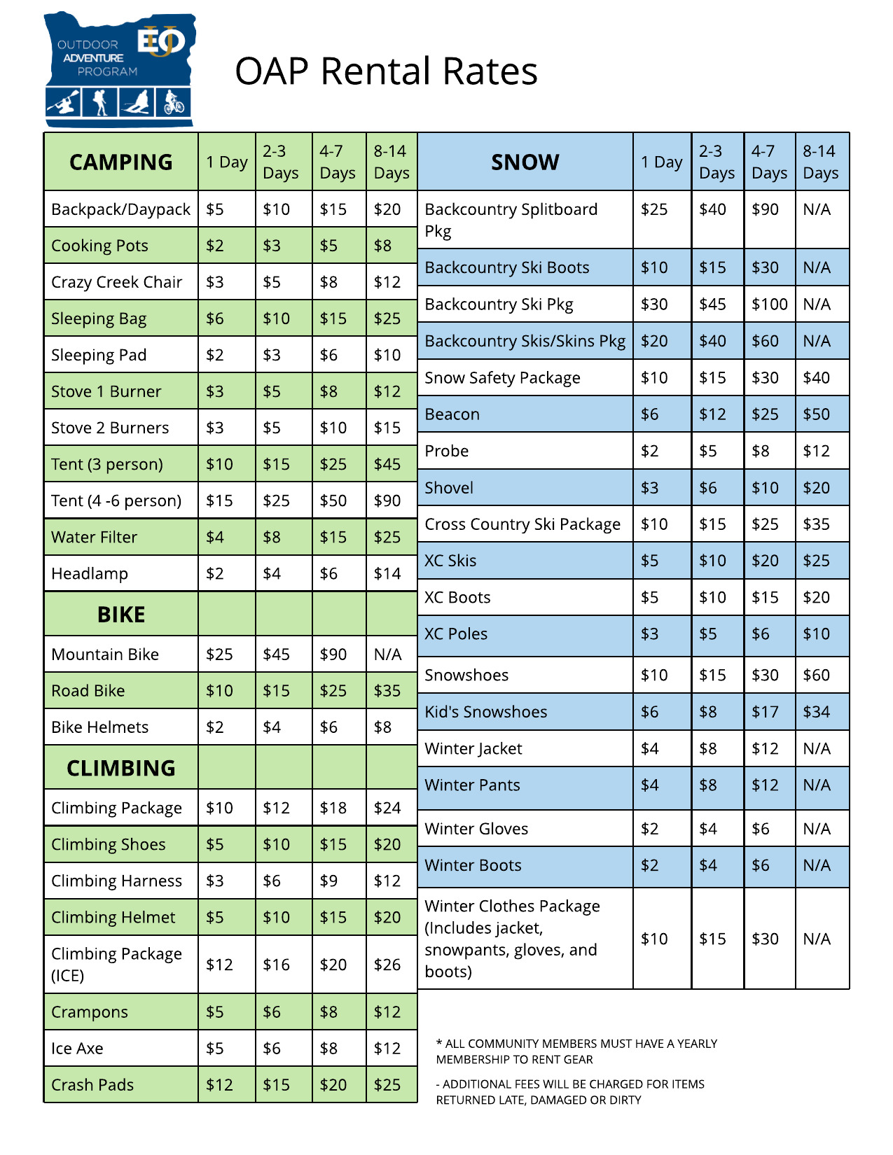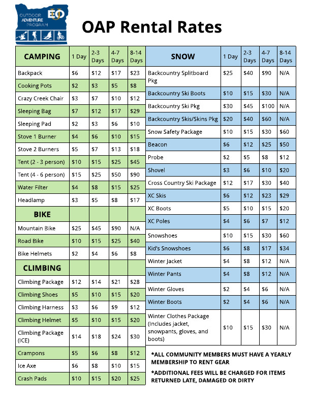 The general public is welcome to rent outdoor equipment after purchasing an annual OAP membership. EOU Alumni receive a 10% discount, Veterans receive a 15% discount, and EOU faculty and staff receive a 25% discounted rate. Additional charges apply to renters who return equipment late, lost, stolen, or damaged.