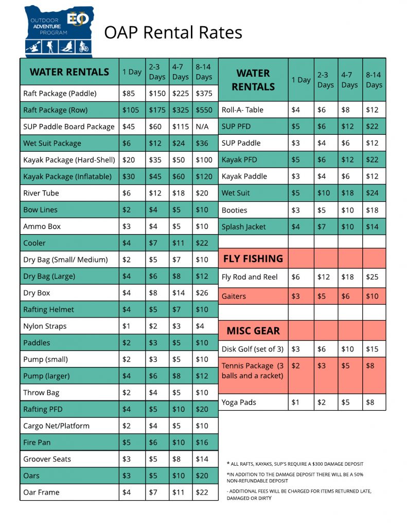 As a student fee funded program currently enrolled on-campus EOU students are members of the OAP and receive FREE rentals. EOU students are limited to renting equipment just for themselves…additional gear rented for friends or family will be charged at general public rate.